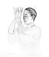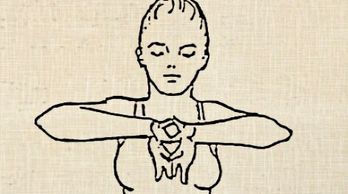 Hold the hands at the level of the heart center. The right hand is on the back of the Ieft hand, both palms face down. The right thumb is bent and comes under the left hand and touches the palm. The left thumb is bent and also touches the left palm. The bent thumbs are pressed together so the thumbnails touch.